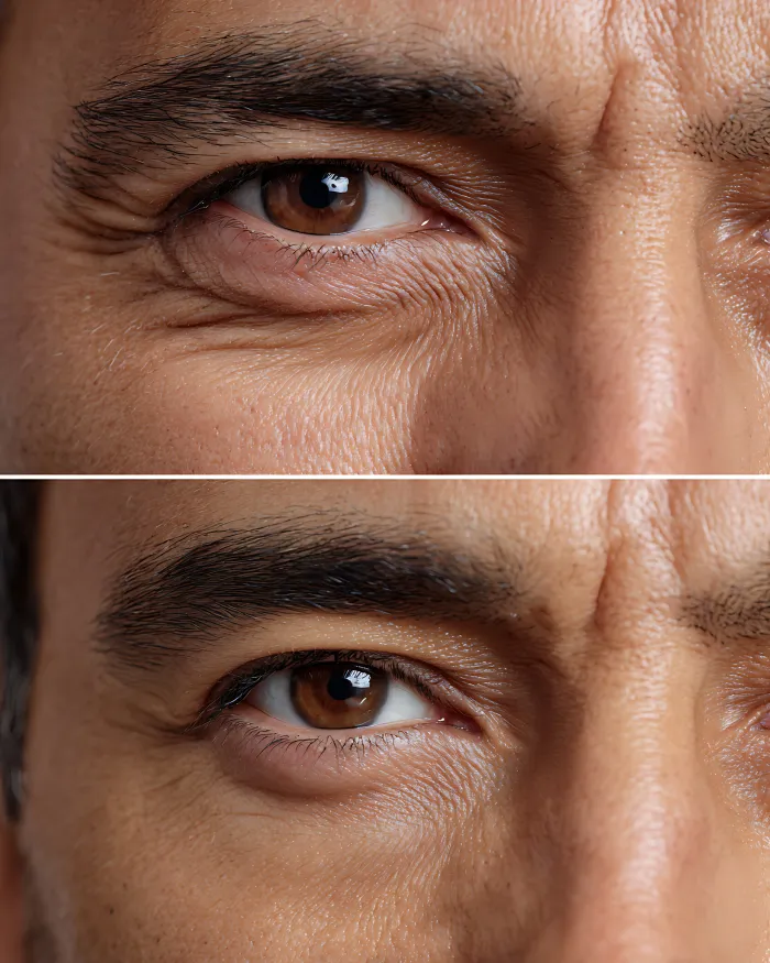 Collagen production is triggered during laser therapy, which tightens the skin to reduce the prominence of eye bags. For brightening the under-eye area, chemical peels, especially with mild acids, help brighten the skin texture and reduce pigmentation.